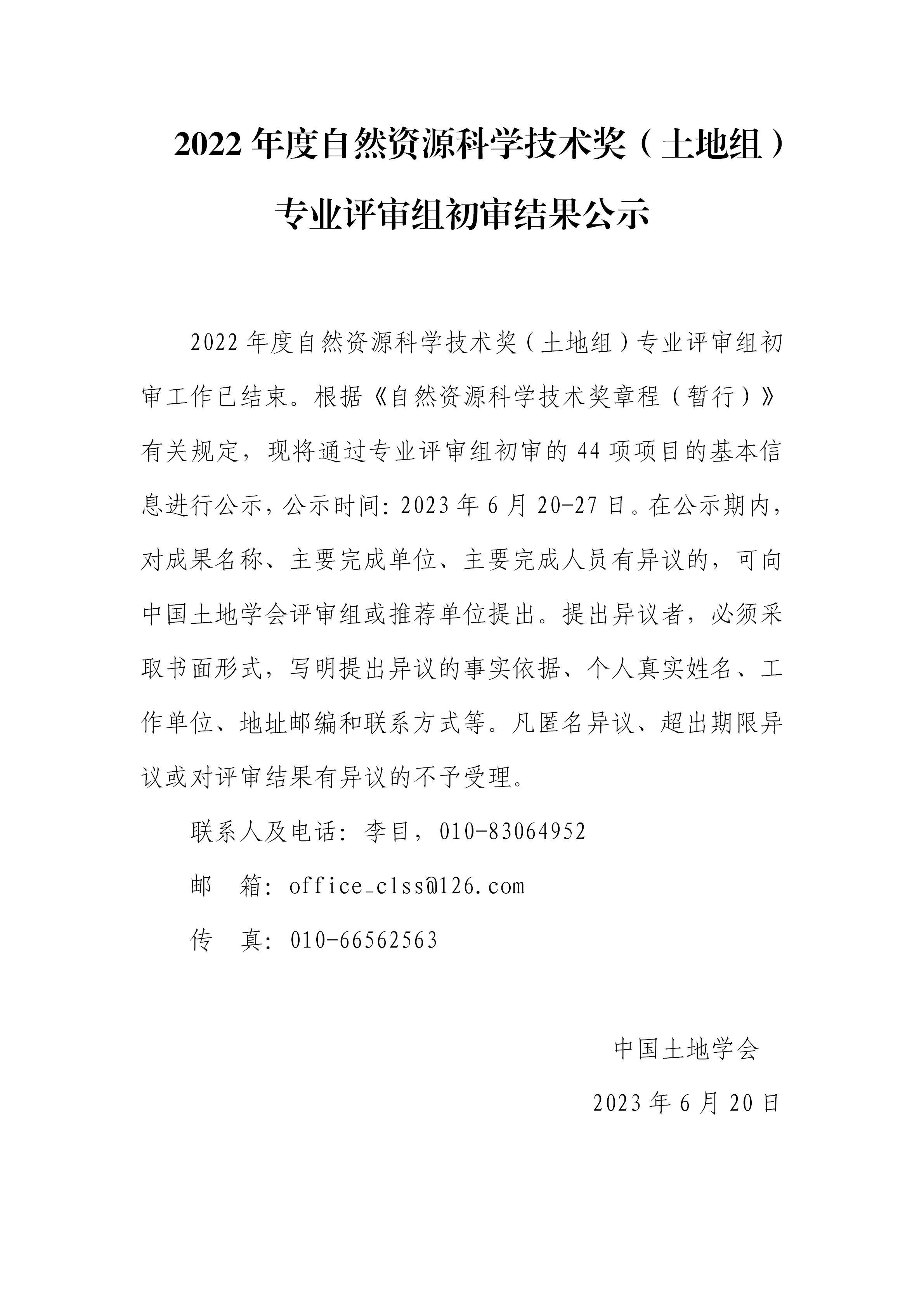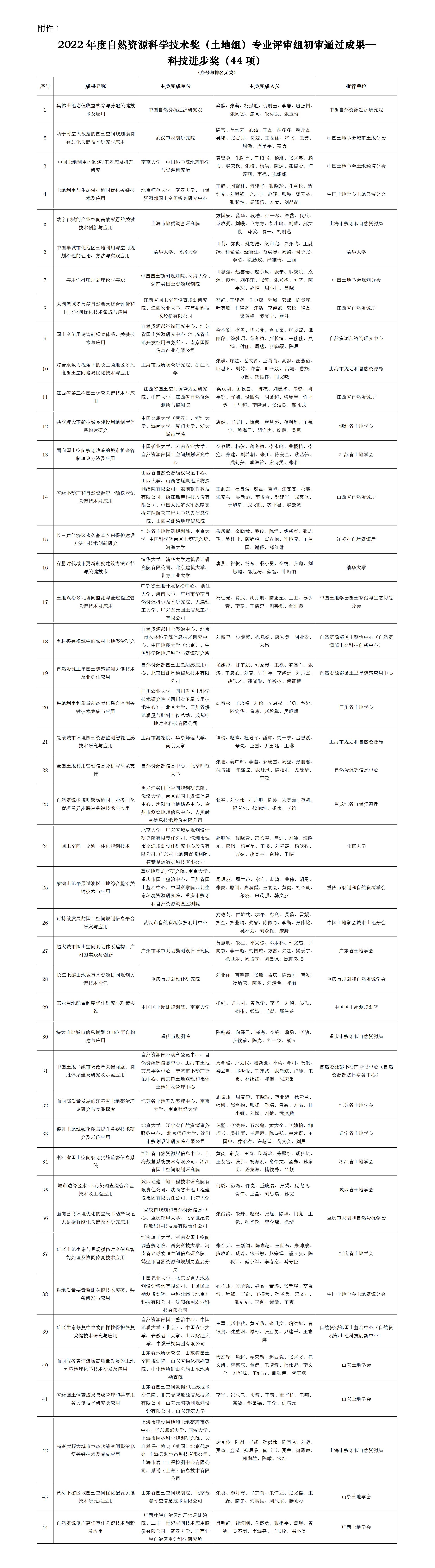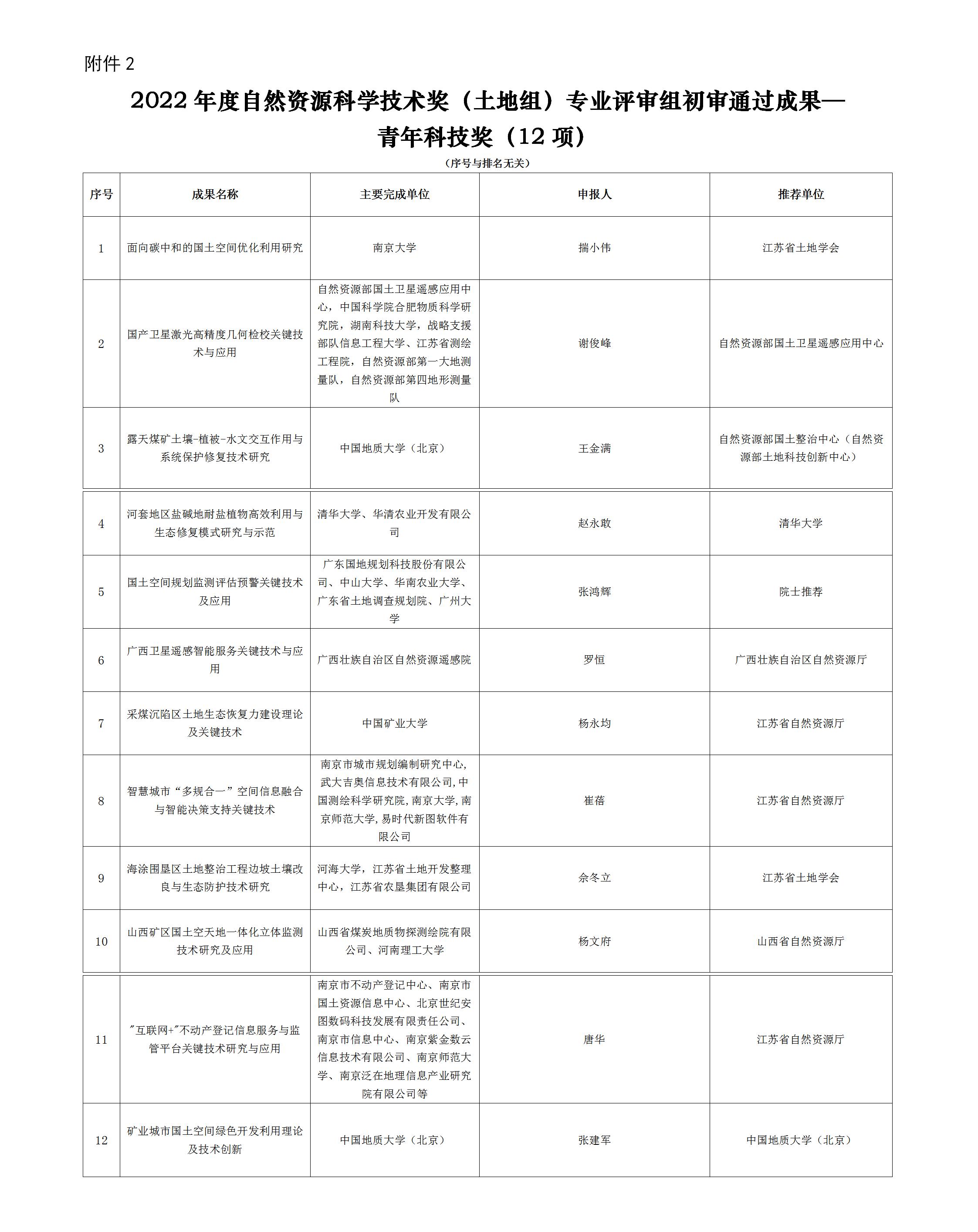 公示|2022年度自然资源科学技术奖(土地组)专业评审组初审结果公示