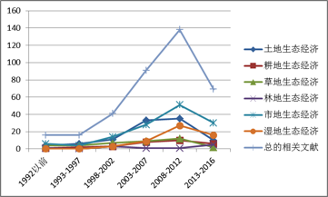 ÍÁµØÉú̬¾¼ÃÑ§Öø×÷µÄ³ö°æ£¬Ò»¶¨³Ì¶ÈÁËÒýÆðÁËѧÕß¶ÔÓÚÍÁµØÉú̬¾¼ÃÎÊÌâµÄ¹Ø×¢£¬´Ó¶øÒ²»ý¼«µØÒýÁìÁËÎÒ¹úÍÁµØÉú̬¾¼ÃÑо¿µÄ·¢Õ¹¡£´Óͼ1¿ÉÒÔ¿´³ö£¬CNKIÖªÍøÏµÍ³ÖУ¬1992Ä꣨º¬µ±Ä꣩ǰÓйØÍÁµØÉú̬¾¼ÃѧµÄÑо¿ÂÛÎĹ²¼Æ16ƪ£¨Õ¼4%£©£¬1993ÄêÒÔÀ´Ôò´ïµ½ÁË355ƪ£¨96%£©£¬ÓÈÆäÊÇÊеØÉú̬¾¼Ã£¨36%£©¡¢ÍÁµØÉú̬¾¼Ã£¨27%£©¡¢ÊªµØÉú̬¾¼Ã£¨15%£©¡¢²ÝµØÉú̬¾¼Ã£¨10%£©¡¢¸ûµØÉú̬¾¼Ã£¨8%£©µÈ·½ÃæµÄÑо¿ÂÛÎÄ×î¶à¡£ÆäÖУ¬Ô¼1/6µÄÍÁµØÉú̬¾¼ÃÂÛÎÄ¡¢1/5µÄ¸ûµØÉú̬¾¼ÃÑо¿ÂÛÎÄÀ´×ÔÍõÍòï½ÌÊÚÅàÑøµÄµÜ×Ó»òÄϾ©Å©Òµ´óѧÍÁµØÑ§¿ÆÍŶӡ£