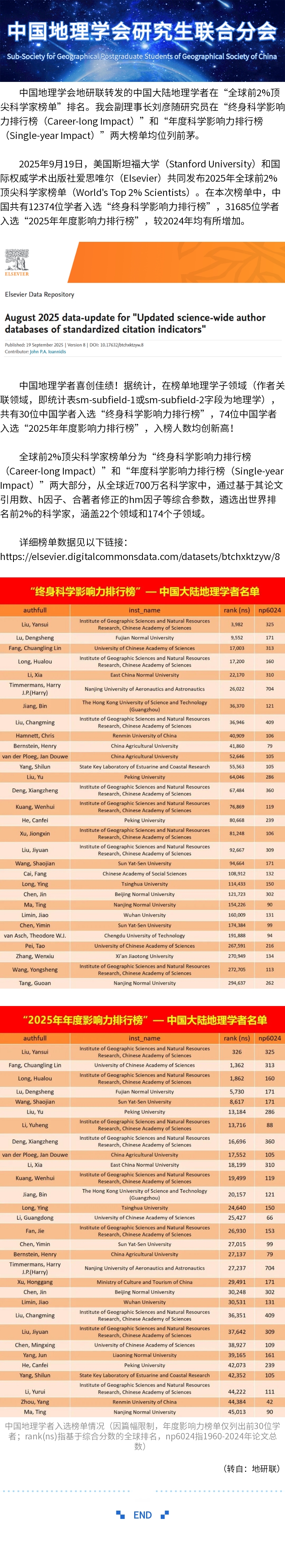 中国地理学者喜创佳绩!我会副理事长刘彦随研究员在“终身科学影响力排行榜”和“年度科学影响力排行榜”两大榜单均位列前茅